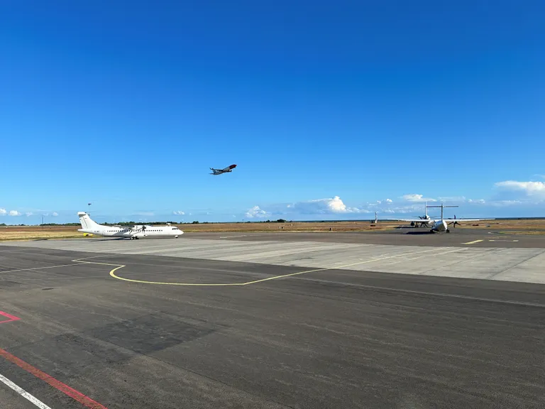 Der er liv i lufthavnen dagen lang fra tidligt om morgenen til sent om aftenen. Det fører ofte til flyvninger i flotte solnedgange, som denne på billedet.