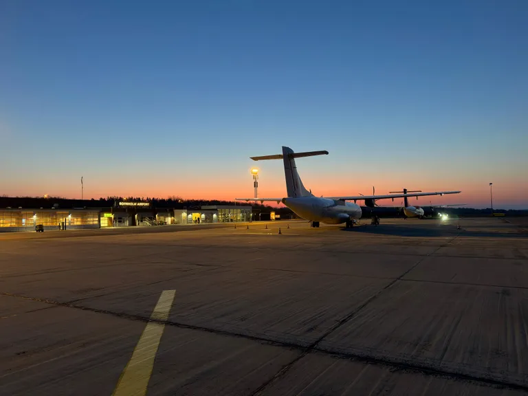 Solopgang over Bornholms Lufthavn. Morgenens to første fly står klar på rampen med afgang kl. 06.15 og 07.00. Vi ønsker alle en rigtig god dag.